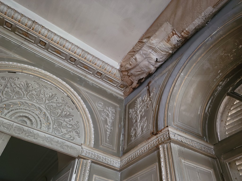 Sadly, in the green room there was a beautiful ornate moulding decoration wrapping around the room where the ceiling met the wall that was missing in sections. To fill the missing gap, paper had been hung to mimic the form, but I noticed in sections where the paper had drooped that behind it was nothing. Another element of the home’s entropy.