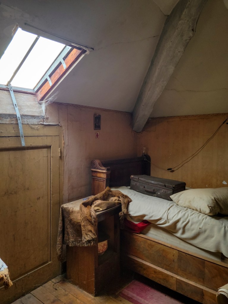 Arriving upstairs, the rooms shrunk to small bedrooms with beds tucked under the slope of the roof above. At one point we found some photos of the family standing in front of the house. It appeared that they had at least a dozen children, so one could imagine that at one point this house was completely full, with all the rooms being used. The center of this floor was illuminated by a series of skylights.